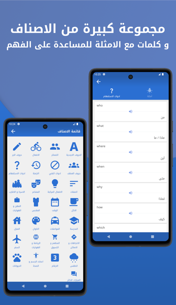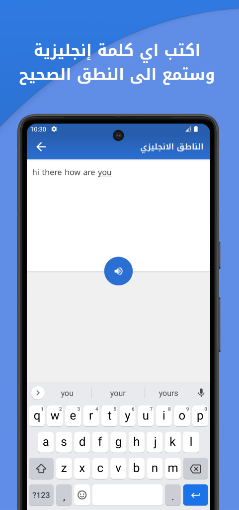 يضم التطبيق على قسم الناطق الانجليزي الدي يحول كل ما تكتبه باللغة الانجليزية في الحقل النصي الى صوت لتعلم مهارة الاستماع و النطق وتوجد ميزة اخرى اضفناها الى التطبيق وهي خاصية الصوت تسمح لك بالضغط الى اي كلمة او عبارة وتسمع كيف تنطق ل تعلم الانجليزية بالصوت.