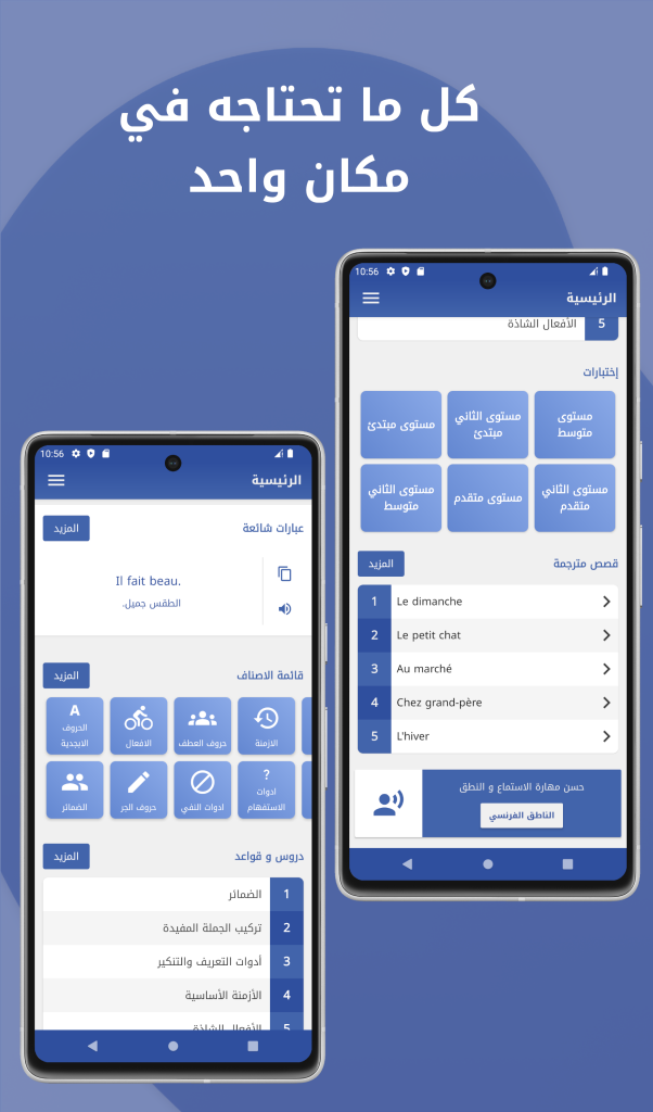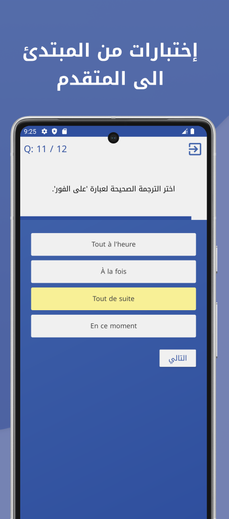 اختبار اللغة الفرنسية :يحتوي التطبيق على واجهة خاصة باختبارات اللغة الفرنسية بحت يحتوي على اختبارات من المبتدئ الى المستوى المتقدم, اختبارات الفرنسية على حسب المستويات