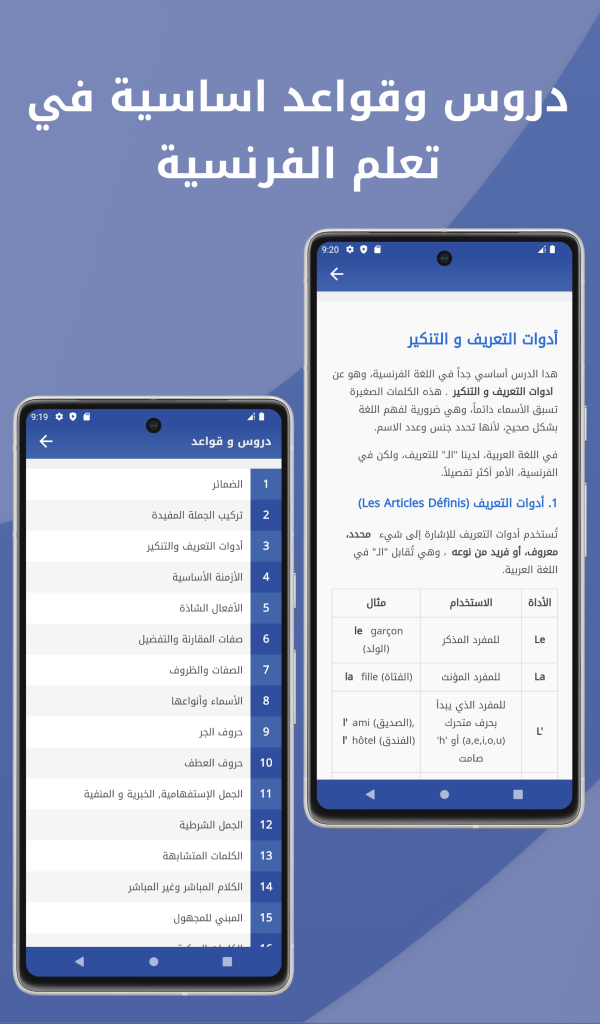 يوجد قسم خاص ب اكثر الكلمات الفرنسية شيوعا و العبارات الاكثر استخداما بالصوت وقسم يضم مجموعة كبيرة من العبارات الاكثر استخداما في اللغة الفرنسية مترجمة الى العربية , ادا كنت تريد اتقان اللغة الفرنسية فيجب ان تقوم كل يوم بتكرار العبارات وفهم الدروس جيدا وسوف تلاحظ تطور رائع في اتقان الفرنسية بسهولة.