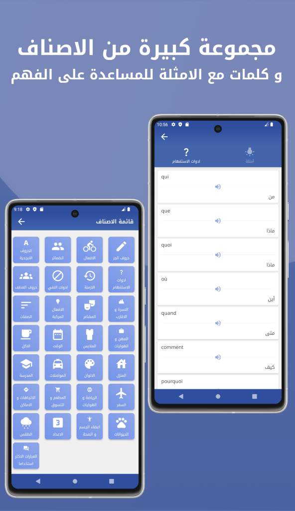 يحتوي على الكلمات و العبارات الاكثر استخداما في اللغة الفرنسية لسهولة الفهم و ايضا يحتوي على اكثر من 29 قسم وكل قسم يحتوي على الكثيير من الكلمات و الامثلة