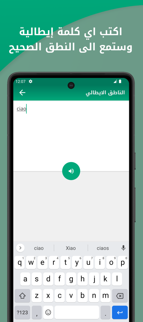 يضم التطبيق على قسم الناطق الايطالي الدي يحول كل ما تكتبه باللغة الايطالية في الحقل النصي الى صوت لتعلم مهارة الاستماع و النطق وتوجد ميزة اخرى اضفناها الى التطبيق وهي خاصية الصوت تسمح لك بالضغط الى اي كلمة او عبارة وتسمع كيف تنطق ل تعلم الايطالية بالصوت.