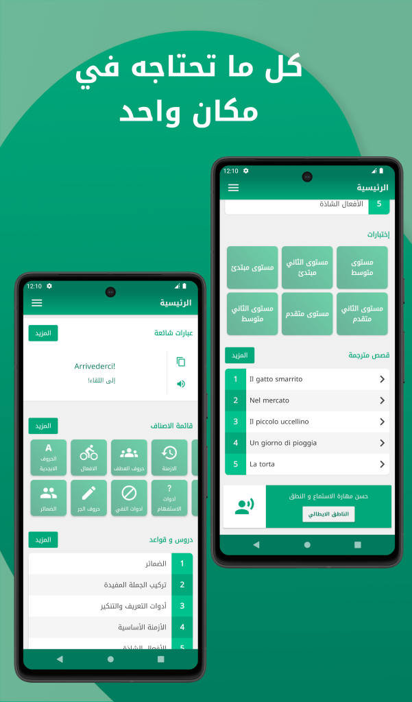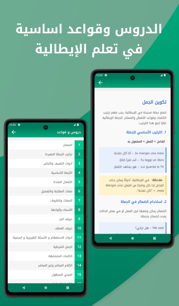 ويحتوي ايضا على قسم يضم مجموعة كبيرة من العبارات الاكثر استخداما في اللغة الايطالية مترجمةالى العربية ,ادا كنت تريد اتقان اللغة الايطالية فيجب ان تقوم كل يوم بتكرار العبارات وفهم الدروس جيدا وسوف تلاحظ تطور كبير في التحدث بالايطالية.